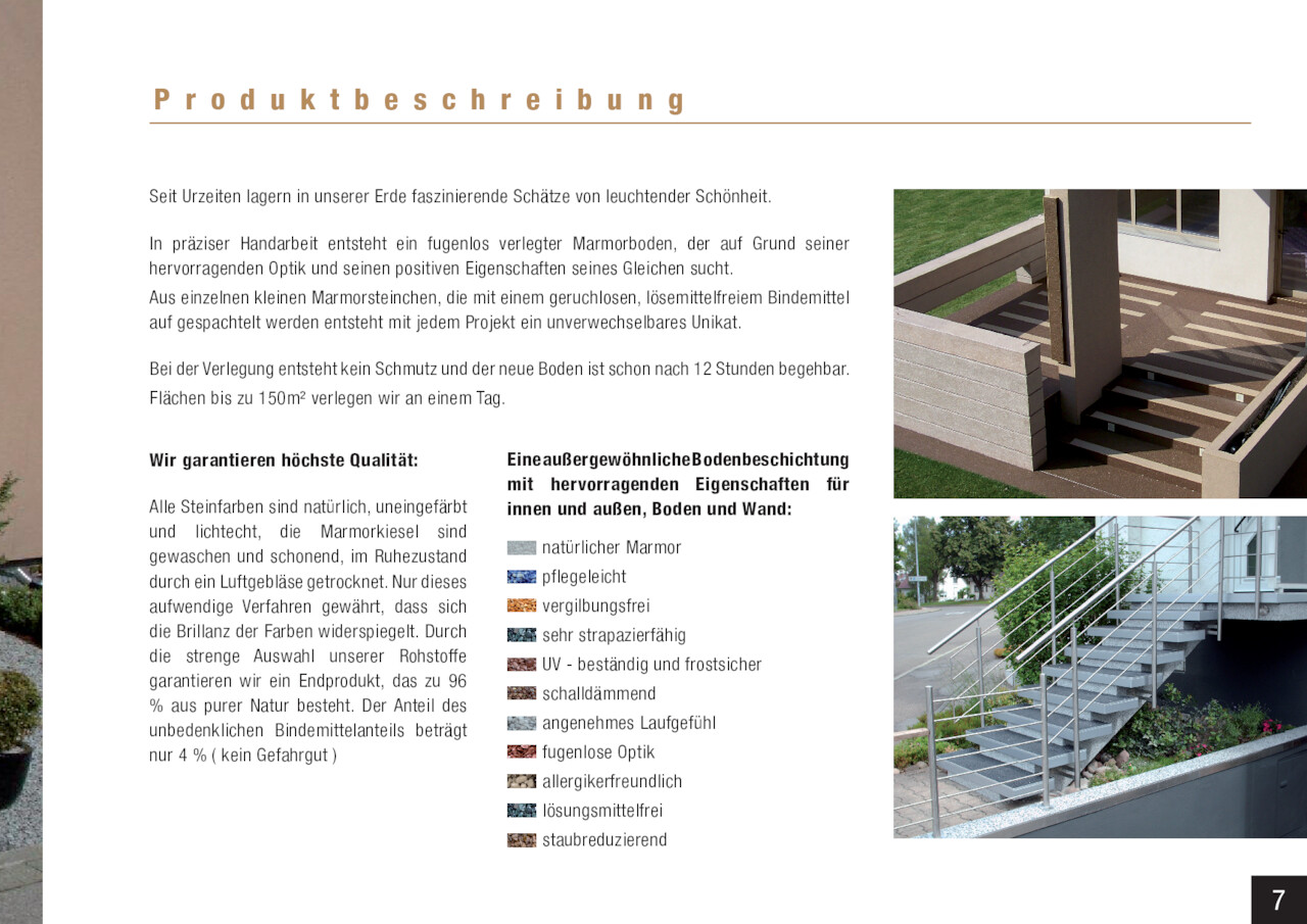P r o d u k t b e s c h r e i b u n g Seit Urzeiten lagern in unserer Erde faszinierende Schätze von leuchtender Schönheit. In präziser Handarbeit entsteht ein fugenlos verlegter Marmorboden, der auf Grund seiner hervorragenden Optik und seinen positiven Eigenschaften seines Gleichen sucht. Aus einzelnen kleinen Marmorsteinchen, die mit einem geruchlosen, lösemittelfreiem Bindemittel auf gespachtelt werden entsteht mit jedem Projekt ein unverwechselbares Unikat. Bei der Verlegung entsteht kein Schmutz und der neue Boden ist schon nach 12 Stunden begehbar. Flächen bis zu 150m² verlegen wir an einem Tag. Wir garantieren höchste Qualität: Alle Steinfarben sind natürlich, uneingefärbt und lichtecht, die Marmorkiesel sind gewaschen und schonend, im Ruhezustand durch ein Luftgebläse getrocknet. Nur dieses aufwendige Verfahren gewährt, dass sich die Brillanz der Farben widerspiegelt. Durch die strenge Auswahl unserer Rohstoffe garantieren wir ein Endprodukt, das zu 96 % aus purer Natur besteht. Der Anteil des unbedenklichen Bindemittelanteils beträgt nur 4 % ( kein Gefahrgut )