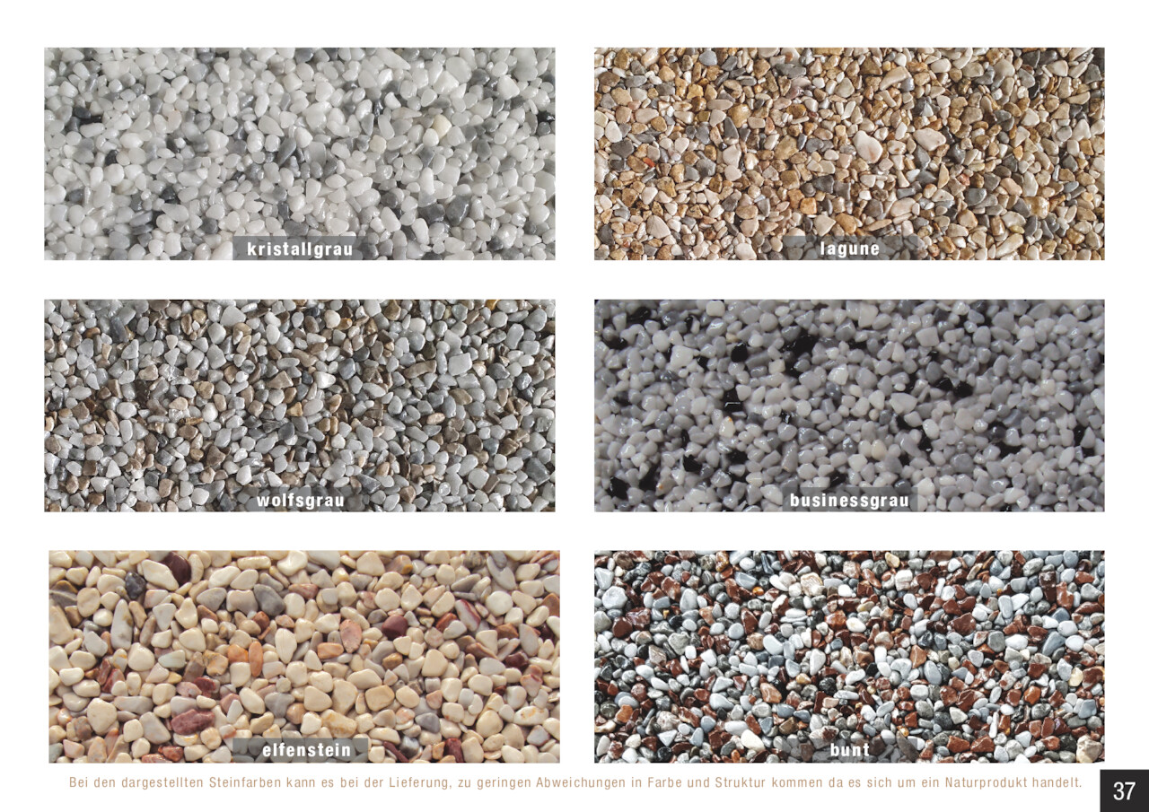 Bei den dargestellten Steinfarben kann es bei der Lieferung, zu geringen Abweichungen in Farbe und Struktur kommen da es sich um ein Na turprodukt handelt.