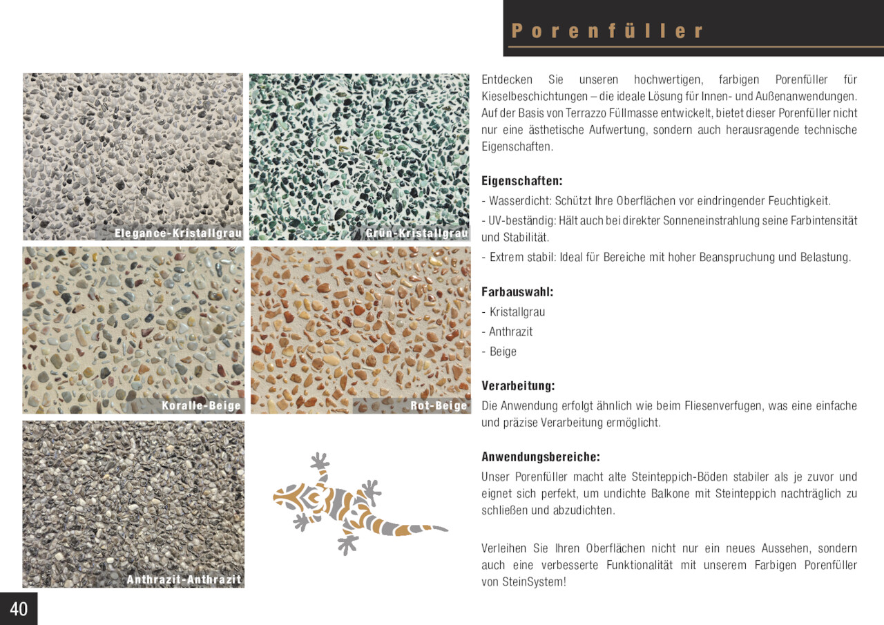 P o r e n f ü l l e r Entdecken Sie unseren hochwertigen, farbigen Porenfüller für Kieselbeschichtungen – die ideale Lösung für Innen- und Außenanwendungen. Auf der Basis von Terrazzo Füllmasse entwickelt, bietet dieser Porenfüller nicht nur eine ästhetische Aufwertung, sondern auch herausragende technische Eigenschaften. Eigenschaften: - Wasserdicht: Schützt Ihre Oberflächen vor eindringender Feuchtigkeit. Ele g ance-Kris tallgrau