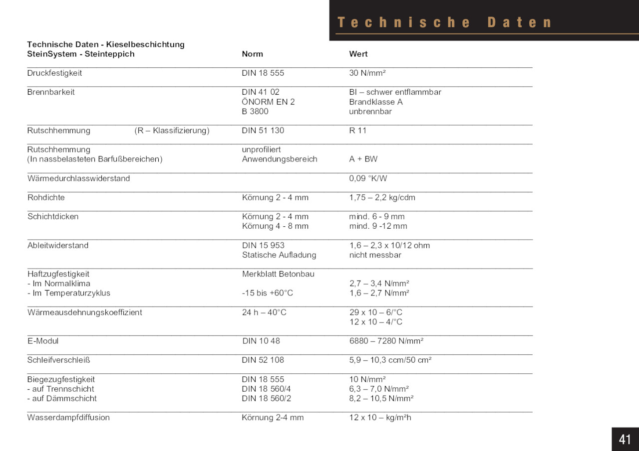 Technische Daten - Kieselbeschichtung SteinSystem - Steinteppich Norm Wert _____________________________________________________________________________________________________________ Druckfestigkeit DIN 18 555 30 N/mm² _____________________________________________________________________________________________________________ Brennbarkeit DIN 41 02 BI – schwer entflammbar ÖNORM EN 2 Brandklasse A B 3800 unbrennbar _____________________________________________________________________________________________________________ Rutschhemmung (R – Klassifizierung) DIN 51 130 R 11 _____________________________________________________________________________________________________________ Rutschhemmung unprofiliert (In nassbelasteten Barfußbereichen) Anwendungsbereich A + BW _____________________________________________________________________________________________________________ Wärmedurchlasswiderstand 0,09 °K/W _____________________________________________________________________________________________________________ Rohdichte Körnung 2 - 4 mm 1,75 – 2,2 kg/cdm _____________________________________________________________________________________________________________ Schichtdicken Körnung 2 - 4 mm mind. 6 - 9 mm Körnung 4 - 8 mm mind. 9 -12 mm _____________________________________________________________________________________________________________ Ableitwiderstand DIN 15 953 1,6 – 2,3 x 10/12 ohm Statische Aufladung nicht messbar _____________________________________________________________________________________________________________ Haftzugfestigkeit Merkblatt Betonbau - Im Normalklima 2,7 – 3,4 N/mm² - Im Temperaturzyklus -15 bis +60°C 1,6 – 2,7 N/mm² _____________________________________________________________________________________________________________ Wärmeausdehnungskoeffizient 24 h – 40°C 29 x 10 – 6/°C 12 x 10 – 4/°C _____________________________________________________________________________________________________________ E-Modul DIN 10 48 6880 – 7280 N/mm² _____________________________________________________________________________________________________________ Schleifverschleiß DIN 52 108 5,9 – 10,3 ccm/50 cm² _____________________________________________________________________________________________________________ Biegezugfestigkeit DIN 18 555 10 N/mm² - auf Trennschicht DIN 18 560/4 6,3 – 7,0 N/mm² - auf Dämmschicht DIN 18 560/2 8,2 – 10,5 N/mm² _____________________________________________________________________________________________________________ Wasserdampfdiffusion Körnung 2-4 mm 12 x 10 – kg/m²h